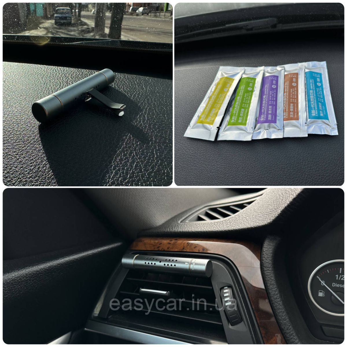 Ароматизатор володіє витонченим та компактним дизайном. Має унікальний механізм регулювання випаровування аромату. Фіксується на решітці повітроводу. В комплекті 5 різних запахів: лимон, османтус, лаванда, океан та парфум. Кріплення: скоба-фіксатор із силіконовим покриттям. Довжина: 8 см. Колір: графіт.