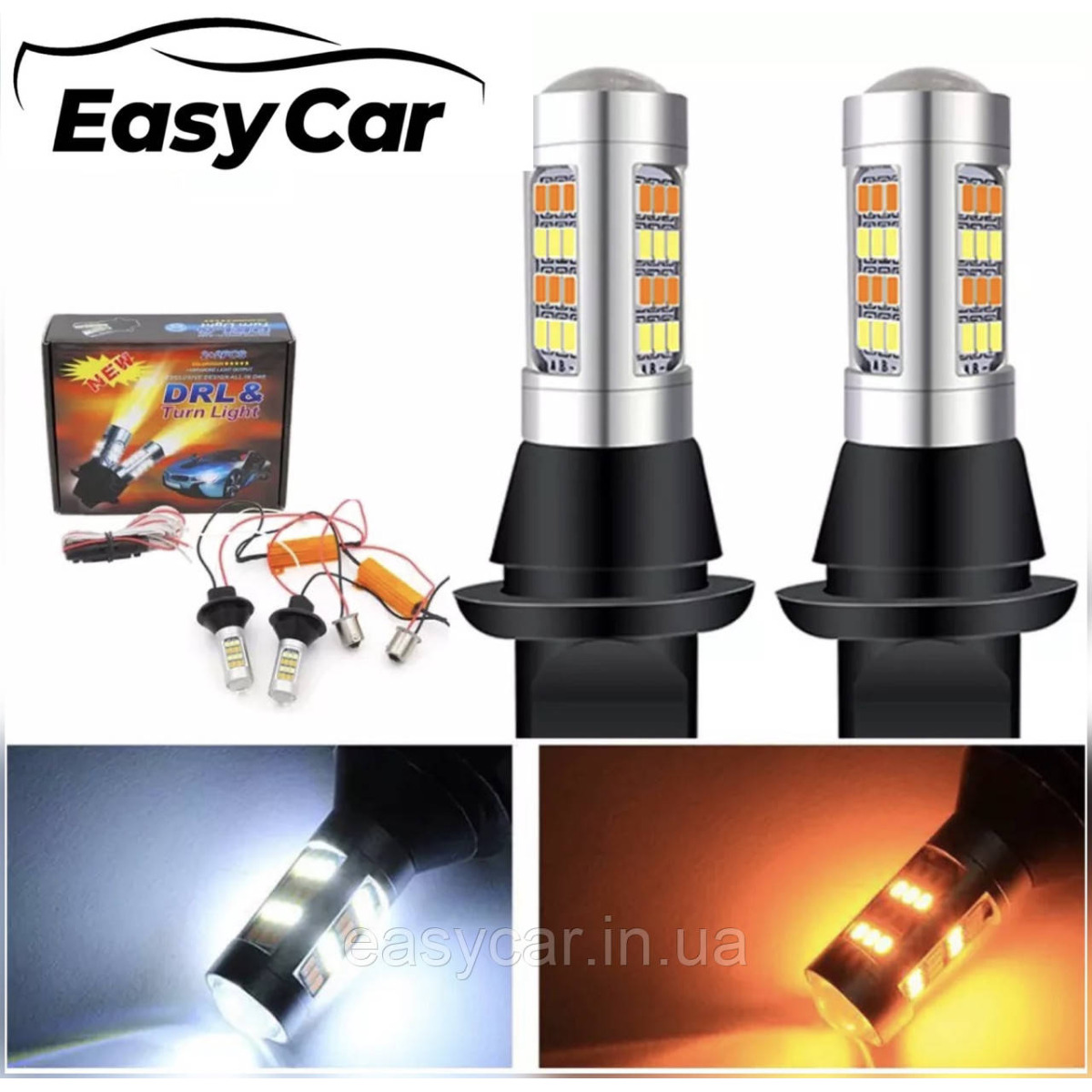 Переваги ламп у поворотники 2 в 1 перед іншими ходовими вогнями: Не змінюють зовнішній вигляд автомобіля. Під“єднуються без втручання в проведення. Не вимагають дорогої розбирання фар. Роблять сигнал повороту яскравішим і помітнішим. Споживають набагато менше електроенергії, порівнюючи з ближнім або дальнім світлом. Денні ходові вогні в поворотники мають ефективне світлорозподілу. Завдяки навантаженому резистору блимають із тією самою частотою, що й звичайні лампи. Встановлення комплекту ламп не забере багато часу та за складності можна порівняти з заміною звичайних лампочок. Система ДХО та поворотник в одній лампі виготовлена із застосуванням передових технологій автомобільного освітлення. Потужні світлодіоди Samsung 2835 — білий і жовтий у кожній лампі. Спеціальна фокусувальна лінза на торці. Корпус ламп виготовлений з алюмінію. Універсальний гумовий цоколь для встановлення практично в будь-які автомобілі. Характеристики: Тип цоколя — PY21W (BAU15S), WY21W (японці) Видавна потужність — 50W Кількість діодів — 42 Робоча напруга — 12 вольтів Споживана потужність — 6/21 Ватів Температура світіння ДХО — 6000 кельвінів Наявність обманки — є Вбудовані стабілізатор і реле поворотів Робоча температура — від -50 до +70 °C Розмір лампи — 14 х 65 мм Діаметр посадкового місця — 24-27 мм Матеріал — алюміній Комплектація 2 світлодіодні лампи дхо в поворотники. 2 х навантажних резистори. комплект проведення під“єднання Якщо цоколь BAU15S вам не підходить, то його можна відрізати та під“єднати лампи безпосередньо.