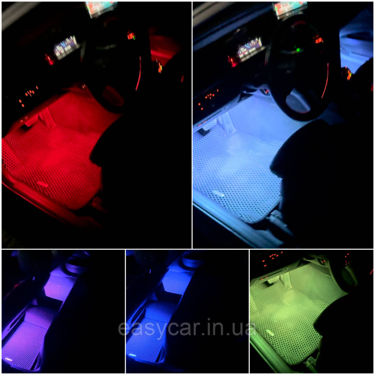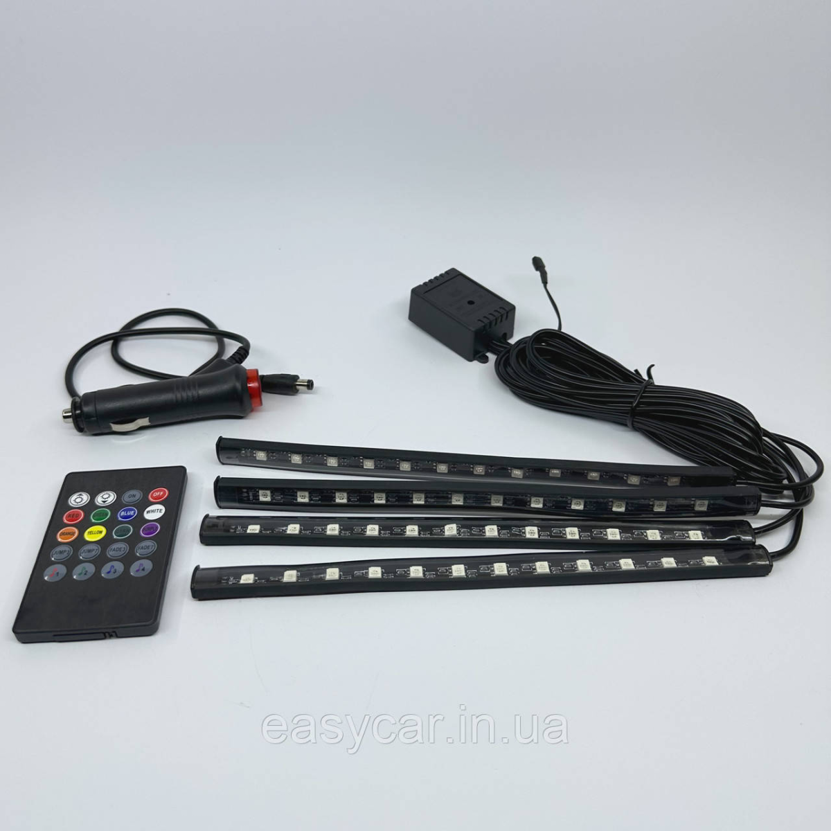 Підсвітка салону автомобіля Led RGB 4х12 (багатобарвна) + Музика Комплект складається з 4 смуг, які кріпляться в автомобілю за допомогою двобічного скотчу, який йде в комплекті. На кожній смузі розміщено по 12 діодів, що дає досить яскраве світіння. Під“єднання виконується за допомогою штекера в прикурювач. На штекері є кнока для вмикання/вимикання підсвітки. За допомогою пульта можна: Міняти кольори підсвітки Вмикати та вимикати підсвітку Регулювати яскравість підсвітки Міняти режими світіння Характеристика: Довжина шнура 2х174 см, 2х122 см. Вимикач на “прикурювачі“ ON-OFF. Кожна лампа — 12 светодиодов. Напруга: 12V DC Двостороння клейка стрічка (легко кріпиться в потрібному місці). Встановлюється на підлогу салону автомобіля або в багажник. Розмір світних елементів 1,5*22 см. Колір багатобарвний