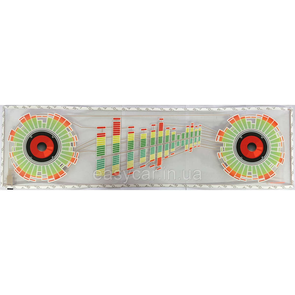 Світлодіодний Еквалайзер на заднє скло автомобіля, світломузка 90 х 25 см З автоматичним підстроюванням під ритм музики. Світлодіодний еквалайзер призначений для ритмічного миготіння в такт музиці, що грає в салоні автомобіля. Пропонована система стане чудовим доповненням до сучасних потужних стереосистем. Живиться цей світлодіодний еквалайзер прикурювача автомобіля, через спеціальний адаптер, що входить до комплекту постачання. Зовні ця підсвітка має вигляд прямокутного відрізок гнучкої пластикової стрічки, на якій закріплені зелені світлодіодні поділки. До комплекту з найбільш «стрічкою підсвітки» входить спеціальний «керувальний блок», у корпус якого вбудований потужний і високочутливий мікрофон, здатний вловлювати навіть тихий звук. Встановлюється «світлодіодна панель» на заднє скло автомобіля або на іншу прозору частину (за бажанням клієнта), а «керувальний блок» розміщується в салоні авто та живиться від прикурювача через спеціальний адаптер. Після того як музика в салоні починає звучати, мікрофон «керувального блока» вловлює ритм басів і передає сигнали на «світлодіодну панель», яка і запалює певні світлодіоди. Відповідно, чим голосніше музика, тим вищий рівень сигналу й тим вищий загоряються «світлодіодні стовпчики». Для регулювання чутливості вбудованого в «блок керування» мікрофона є регулятор, що дає змогу посилити або заглушити мікрофон. З боку, створюється враження, що еквалайзер стереосистеми системи автомобіля проєктується або вбудований у скло машини, особливо сильно відчуття створюється в темну пору доби. Отже, якщо Ви любите автомобільних «ґаджетів» і бажаєте виділити своє авто серед «сірої маси» інших машин, тоді цей світлодіодний еквалайзер на заднє скло автомобіля з автоматичною підстроюванням під ритм музики допоможе впоратися з цією завданням. Особливості та характеристики: Висока якість виготовлення Неймовірно тонкий пластик майже не видно на склі Низька споживана потужність Термін експлуатації понад 20 000 годин Можливість регулювання чутливості мікрофона Споживана потужність: 1 мВт на квадратний сантиметр. Товщина плівки: 0,35 мм. Довжина дроту: 2 метри Джерело живлення: 12 В (24 В не підходить) Розмір і колір : 90 х 25 см Комплектація Світлодіодний еквалайзер на заднє скло автомобіля — 1 шт. Блок керування з кабелем — 1 шт. Автомобільний адаптер — 1 шт.
