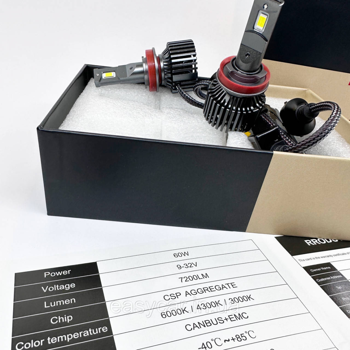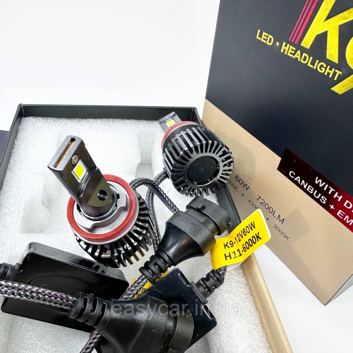 LED H11 (5500K) Світлодіодна лампа, K9 60 W 14400 Lm CANBUS Висококласна геометрія лампи, розроблена японськими інженерами. Гарантовано розв“язує проблеми з новими VW, Skoda, Audi, Toyota, KIA та ін. автомобілями з бортовими комп“ютерами. Гарантія — 12 міс. Мініатюрний розмір корпусу лампи. Температура світіння — 5500 К Охолоджувальний елемент із кулером. Зовнішній драйвер. Постачаються парами в коробці. Цоколь — Н11 Робоча напруга: 12-24V. У наявності також перехідники кріплення ламп практично на всі авто, уточніть у менеджера наявності на ваше авто